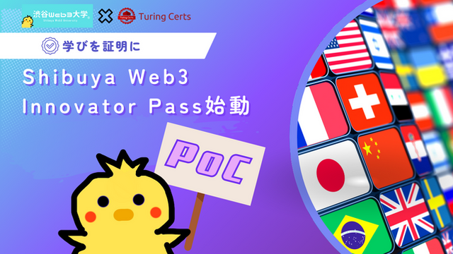 渋谷Web3大学株式会社(本社:東京都渋谷区、代表取締役:北村 元)の運営する渋谷Web3大学は、5月開催予定の第28回 Web3 勉強会より、以前からの渋谷Web3大学 アドバイザー企業である Turing Japan と提携し、同社のソリューション 「Turing Certs」 を利用したイベント参加チケット 「Shibuya Web3 Innovator Pass」 をブロックチェーン証明書として発行する PoC(概念実証)を開始します。本 PoCは以後毎月継続し、段階的に対象を拡大します。