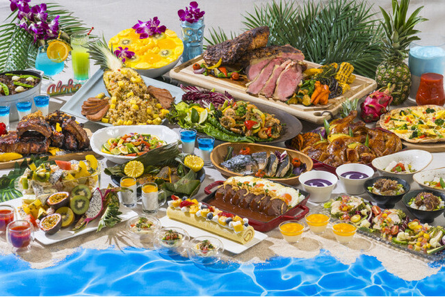 新鮮な魚の醤油漬けをご飯の上に載せた「ポケボール」や、香ばしさがお酒と相性ピッタリの「ガーリックシュリンプ」、「ロコモコ」などのハワイの定番料理から、サステナブルフィッシュを葉で包み蒸し焼きにした「ラウラウ」や特製ソースを何度も塗りながら焼き上げる「フリフリチキン」などの伝統料理まで、約10種類をラインアップ。ライブステーションには出来立てのパスタ「ジェノベーゼ」と見た目も夏らしく爽やかな「冷製夏野菜のカッペリーニ」のほかに、パイナップルの甘味とチーズの塩味が抜群の「ハワイアントロピカルピザ」や、あっさりしたスープを用いたローカルヌードル「サイミン」などが登場。さらにカーヴィングステーションではケイジャンスパイスでマリネして仕上げた「ケイジャンマリネローストビーフ」をシェフが目の前でご提供。デザートには週末限定で開催中のスイーツビュッフェより選りすぐりのスイーツをご賞味いただけます。