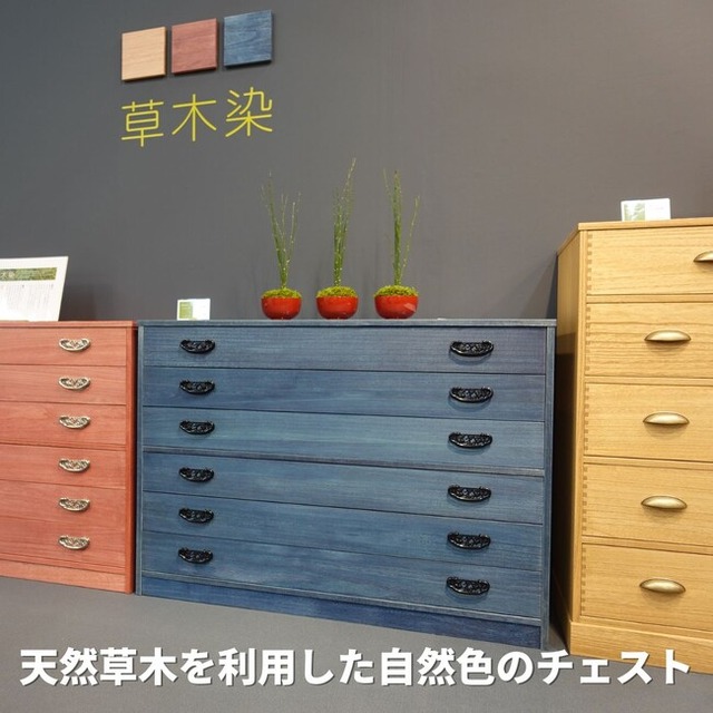 株式会社大川家具ドットコム(代表:堤太陽、所在地:福岡県大川市)は、天然の桐無垢材に藍・紫根(商品化検討中)・柿渋染めを施した「草木染総桐6段チェスト」を発売しました。