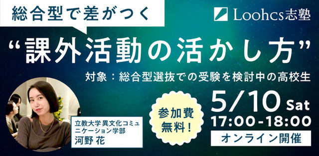 Loohcs株式会社(代表取締役 :嶺井 祐輝 本社所在地: 渋谷区桜丘町)は、2025年5月10日(土)17:00より、総合型選抜を目指す高校生を対象とした無料オンラインイベント「総合型で差がつく 課外活動の活かし方」を開催いたします。