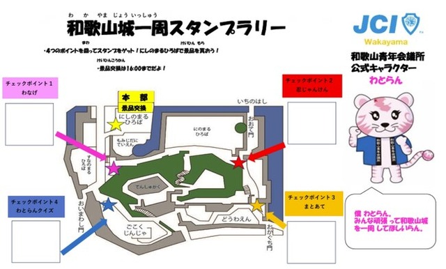 その中で一般社団法人和歌山青年会議所は、和歌山城一周スタンプラリーを実施いたします。和歌山青年会議所の公式キャラクターである「わとらん」に関するわとらんクイズや輪投げゲーム、各チェックポイントを楽しみながら、和歌山城を巡っていただける企画となっております。皆さま是非ともご参加ください!