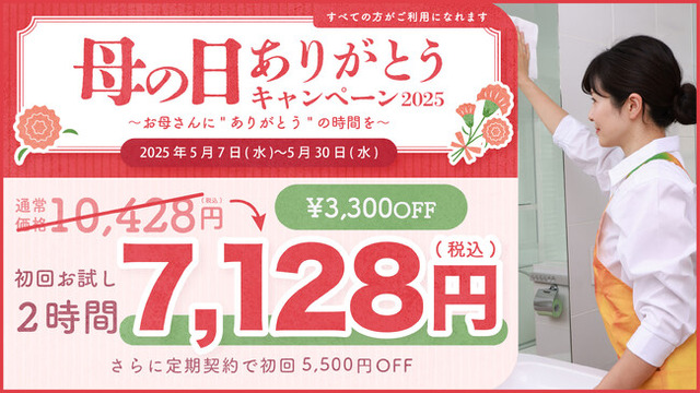 「今年の母の日は、少し変わった感謝の伝え方をしたい」。「母の日ありがとうキャンペーン2025」は、そんな想いを抱く皆様の声にお応えする企画です。日々の家事から解放され、自分のためだけの時間を過ごせる家事代行サービスのプレゼントは、言葉だけでは伝えきれない感謝の気持ちを伝える、新しい母の日の贈り物として注目を集めています。経験豊富なスタッフが、掃除、片付け、洗濯、キッチンや水まわりの清掃など、ご家庭の様々な家事を丁寧に代行し、お母様へ安らぎのひとときをお届けします。■キャンペーン概要