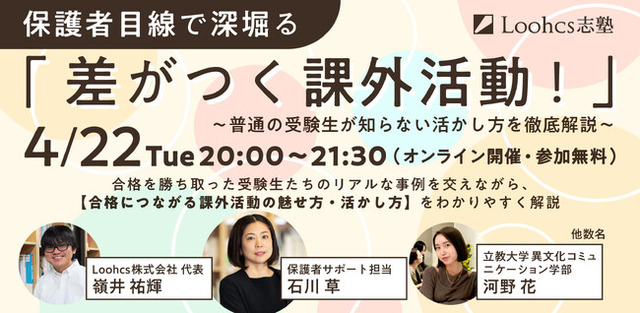 株式会社Loohcs(本社:東京都渋谷区)は、2025年4月22日、総合型選抜を志す生徒・保護者向けに、特別イベント「総合型選抜 合格者に学ぶ!課外活動とサポートのリアル」を開催しました。当日は、多くの保護者の皆様にご参加いただき、実際に総合型選抜で合格を勝ち取った先輩方の体験談に耳を傾ける貴重な機会となりました。