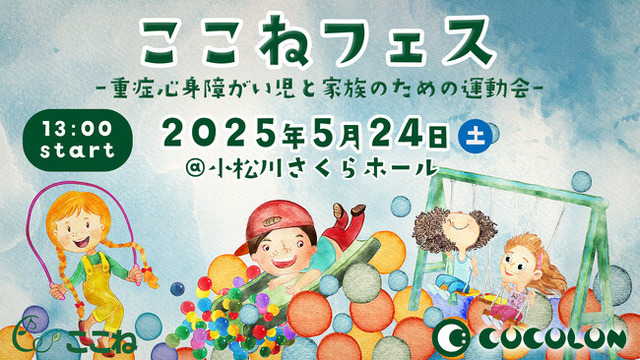 重症心身障がい児のと家族や支援者向けに学び・遊び・情報を提供をする「COCOLON」(運営:特定非営利活動法人EPO、東京都江戸川区、代表:齋藤えりか)は、2025年5月24日(土)に障がいや医療的ケアを抱えるお子様本人・きょうだい児・家族が一緒に参加できる運動会「ここねフェス」を開催します。重い障がいがある子どもたちも競技者となり、家族と一緒に運動会に参加することができます。