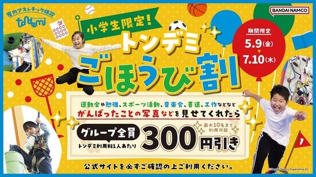 株式会社バンダイナムコアミューズメントは、全国の屋内アスレチック施設『トンデミ』にて、2025年5月9日(金)~7月10日(木)の期間中、小学生のお子さまが運動会やテストなどで頑張った写真などを入場時に提示するとグループ全員トンデミ利用料がおトク(※1)になる「ごほうび割」を実施します。