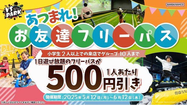 株式会社バンダイナムコアミューズメントが運営する屋内“ヤバすぎ”アクティビティ施設『VS PARK』は、小学生2人以上で来店し、店頭で「いこーよクーポン」を提示すると、1日中遊び放題のフリーパスが最大10人まで1人あたり500円割引になる、「あつまれ!お友達フリーパス」を2025年5月12日(月)から6月12日(木)まで販売します。