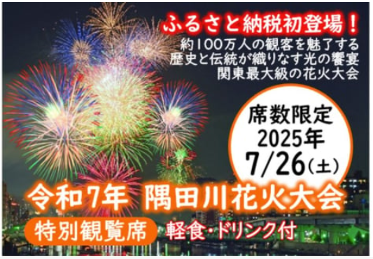国内最大級のふるさと納税総合サイト「ふるさとチョイス」を企画・運営する株式会社トラストバンク(本社:東京都品川区、代表取締役:川村憲一、以下「トラストバンク」)は本日5月8日、今月11日より、東京都墨田区へのふるさと納税のお礼の品として、今夏開催予定の第48回隅田川花火大会の特別観覧席を提供することをお知らせします。このお礼の品は、ふるさとチョイスのみでの提供です。