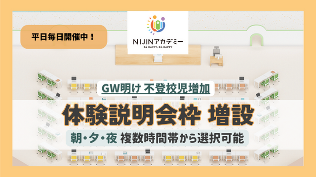 株式会社NIJIN(本社:東京都江東区、代表取締役:星野達郎)が運営する不登校オルタナティブスクール『NIJINアカデミー』は、連休明けの不登校児童・生徒の増加を受け、『体験説明会』を一日2回に増設したことをお知らせいたします。