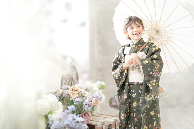 特に、ビンテージとは異なる味わいのコフレオリジナル和装は七五三撮影でも大変人気が高く、ごきょうだいやご家族様のトータルコーディネートのご提案や、お⾐装のレンタルも可能です(※3)。お宮参りの産着レンタルサービスも承っており(※4)、撮影前後1か月の期間であれば無料でご利用いただけます。