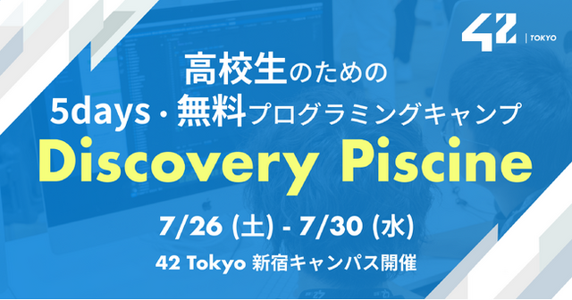 一般社団法人42 Tokyo(本社:東京都新宿区、代表理事:坂之上洋子、以下「42 Tokyo」)は、2025年7月26日(土)~ 7月30日(水)の5日間で、高校生向け無料プログラミングキャンプ「Discovery Piscine」を開催いたします。