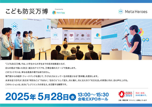 株式会社Meta Heroes(本社所在地:大阪府大阪市、代表取締役:松石和俊、以下「当社」)は、2025年5月28日(火)に開催される「防災万博」(大阪・関西万博EXPOホール)にて、13:00~15:30の時間帯に次世代の防災リーダーたちが登壇する特別プログラム「こども防災万博 - Presented by Hero Egg -」を開催いたします。