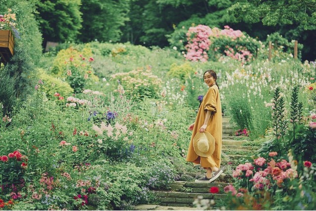 山々と青空を背景に、色とりどりのローズとその香りに魅了されるガーデン。ガゼボやガーラントにつたうローズと風にそよぐ花々が楽しめるガーデンです