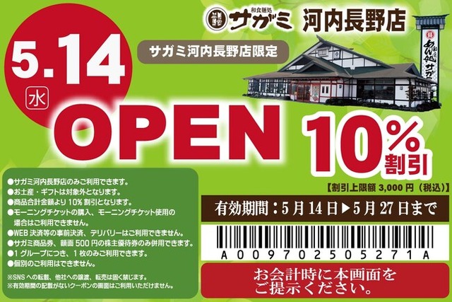 また、サガミ河内長野店限定でご利用いただける割引券を記載いたしました。この画面を掲示で期間中、何度でもご利用いただけます。