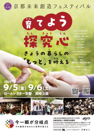 2025 年9月5日(金) 6日(土)に「京都未来創造フェスティバル」を開催いたします。今年のテーマは、「育てよう 探究心 きょうの暮らしの「もっと」を叶える」です。子どもから大人まで、フォーラムや各種企画を通し、京都の魅力を「もっと」知り、暮らしの「もっと」を叶える 方法を知るイベントです!開催場所は、昨年度に続きロームシアター京都に加え、岡崎公園までエリアを拡大!多くの方 に楽しんでいただける企画をご用意しております。皆様のご来場をお待ちしております。