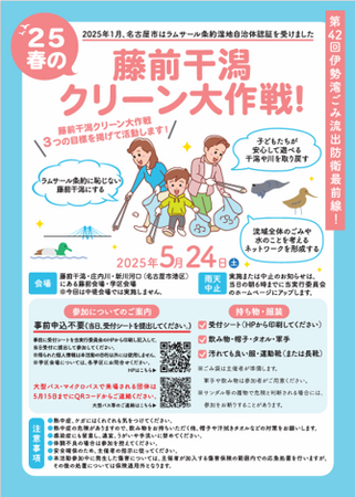 一般社団法人海と日本プロジェクトin愛知県は、2025年5月24日(土)にラムサール条約登録湿地である「藤前干潟」周辺の漂着ごみを清掃して海洋ごみを減らすことを目的とする「’25春の藤前干潟クリーン大作戦!」を開催します。このイベントは、次世代へ豊かで美しい海を引き継ぐために、海を介して人と人とがつながる“日本財団「海と日本プロジェクト」”の一環です。