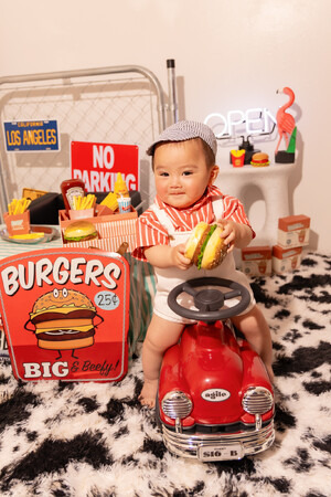 おちゃめなガレージ風ハンバーガー屋の店員さんをイメージで、ハンバーガーやポテトなど提供したりかっこいい車で配達したりできる楽しい空間に。お子様と一緒に遊びながら撮影!