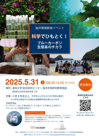 海洋研究と海洋保全に取り組む一般社団法人タラ オセアン ジャパン(所在地:東京都、代表理事:エチエンヌ・ブルゴワ、以下「タラ オセアン ジャパン」)は、「Tara JAMBIO ブルーカーボンプロジェクト」の一環として、2025年5月31日(土)に高知県土佐市宇佐にある高知大学総合研究センター 海洋生物研究教育施設にて、海洋教育イベント「科学でひもとく!ブルーカーボン生態系のチカラ」を開催いたします。