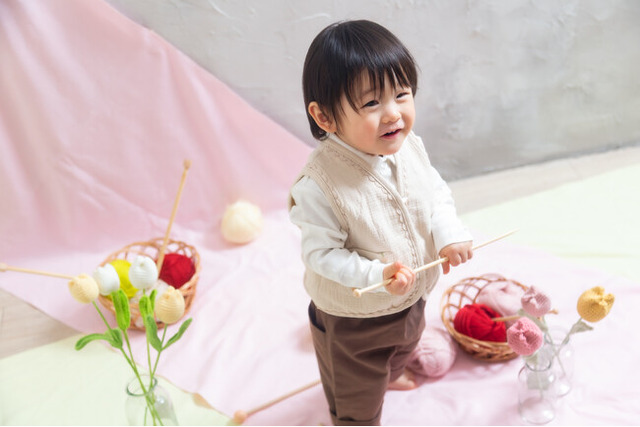小さな手が伸ばす先にあるのは、優しく編まれた毛糸の花。ピンクと黄色の布の上に並ぶカラフルな毛糸のチューリップです!