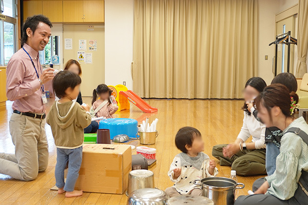 普段身の回りにある物を「太鼓」にしてリズム遊びをしながら、ギターの生演奏に合わせてみんなでうたを歌う内容で、昨年に続き2回目の開催です。
