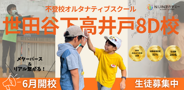 株式会社NIJIN(本社:東京都江東区、代表取締役:星野達郎)が運営する不登校オルタナティブスクール『NIJINアカデミー』はこの度、リアル教室“世田谷下高井戸8D校”を開校することをお知らせいたします。