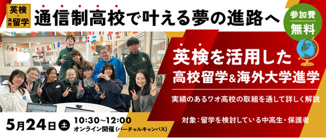 2025年5月24日(土)10:30-12:00通信制高校だから叶う、留年せずに長期高校留学する仕組みや、海外大学進学に必要なスキル、英検を活用した英語力アップの方法などを、ワオ高校の実例を通して詳しくお伝えします。