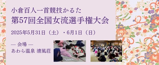 一般社団法人全日本かるた協会(所在地:東京都文京区)は、あわら市の共催により「小倉百人一首競技かるた 第57回全国女流選手権大会」を、あわら温泉 清風荘(福井県あわら市)にて今年も開催いたします。和装姿の選手たちが集う華やかさも注目される本大会では、5月31日(土)にB級・C級、6月1日(日)にA級の大会を行い、階級別に女性日本一を決定します。