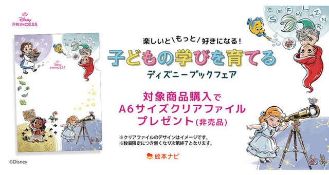 絵本ナビ上の特設ページでおすすめのディズニー絵本・児童書の一覧を公開、絵本ナビ&丸善ジュンク堂書店の5店舗で対象書籍のご購入・ご予約特典として、合計先着700名さまへ、ディズニープリンセスの非売品A6版クリアファイルをプレゼントします。