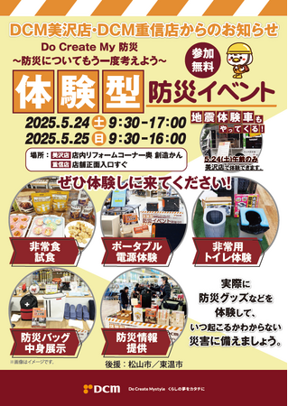 全国でホームセンター事業等を展開するDCM株式会社(本社:東京都品川区、代表取締役社長:石黒靖規、以下、「当社」)は、DCM美沢店(愛媛県松山市)およびDCM重信店(愛媛県東温市)にて、「Do Create My 防災 ~防災についてもう一度考えよう~」をテーマに体験型防災イベントを開催します。