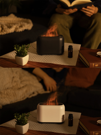 「超音波アロマディフューザー」は、LEDライトの光を選んで照射すると、ミストがまるで本物そっくりな炎のように、幻想的なゆらぎを演出してくれる製品です。特に暗いお部屋では温かみのある光を放ちます。