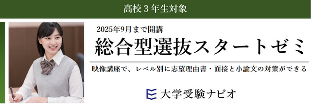 株式会社増進会ホールディングス(Z会グループ)のグループ会社、株式会社栄光(本社:東京都千代田区 代表取締役社長:下田勝昭)が運営する大学受験専門塾「大学受験ナビオ」は、高校3年生対象「総合型選抜スタートゼミ」を、現在開講しています。標準/発展のレベル別に、総合型選抜で求められる「志望理由書・面接」と「小論文」の力を身に付けます。