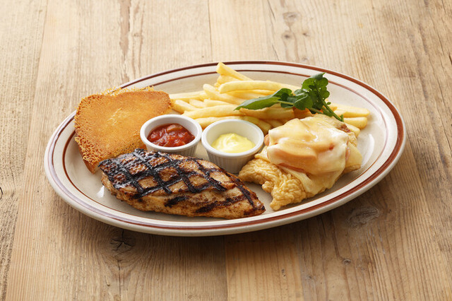 みつせ鶏むね肉をチリ・コリアンダー・ライム等でマリネしたスパイシーな「サンタフェチキン」と、衣をつけてフライしたみつせ鶏にハムとラクレットチーズをのせた「マリブチキン」のコンビネーションです。