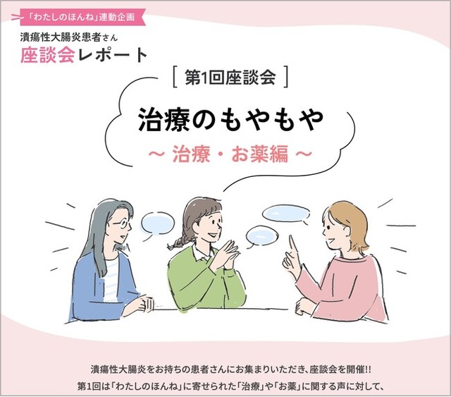 その一環として、匿名で投稿できるプラットフォーム『わたしのほんね』に寄せられた声をもとに、潰瘍性大腸炎患者さん3名と座談会を実施。「治療のもやもや~治療・お薬編~」をテーマに、心の中の“ほんね”、治療変更のきっかけや医師とのコミュニケーションなどの体験談について語り合いました。