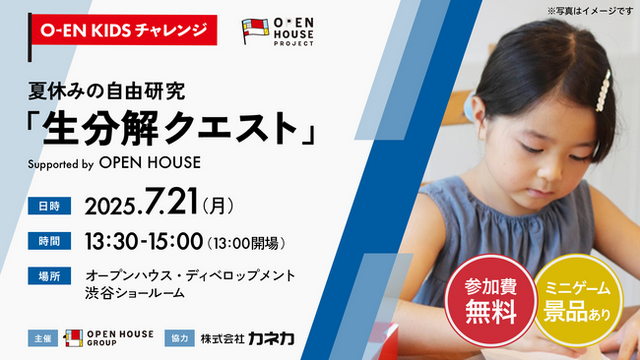 株式会社オープンハウスグループ(本社 東京都千代田区、代表取締役社長 荒井正昭、以下「当社」)は、株式会社カネカ(以下「カネカ」)と共同し、2025年7月21日(月・祝)にイベント「生分解クエスト~地球に還る素材とは!?~」を開催いたします。昨年に引き続き2度目の実施となります。