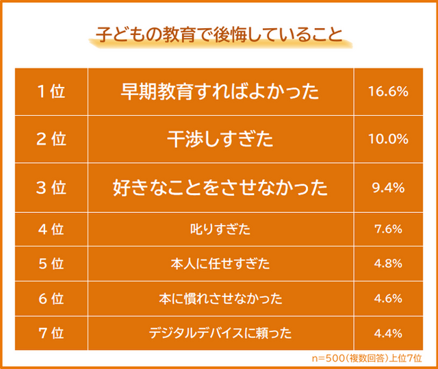 「子どもの教育で後悔していること」の1位は「早期教育すればよかった(16.6%)」でした。2位「干渉しすぎた(10.0%)」、3位「好きなことをさせなかった(9.4%)」が続きます。