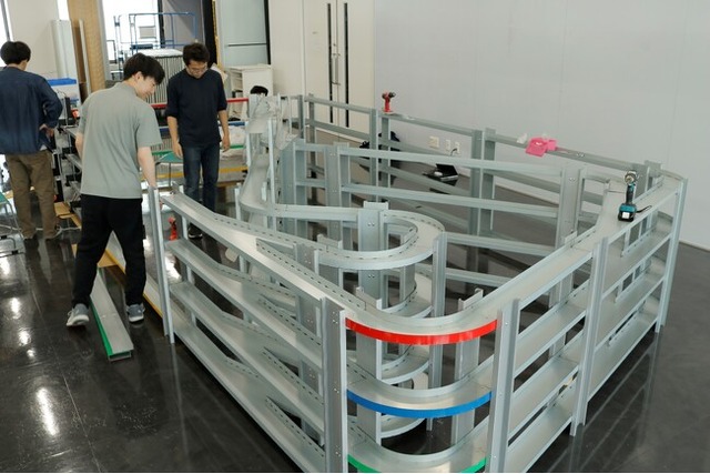 今回のコースは、大阪工業大学の機械工学科とロボット工学科の学生たちが既存コースを元に設計。試作板金加工の職人が、その設計を具現化しました。ランダムで進路が変わる分岐ポイントや、ショートカットできるジャンプ台など、学生のアイデアがコース上にリアルに再現されています。中でも注目なのがジャンプ台で、角度・距離・着地の衝撃まで何度も検証を重ねながら製作しました。学生たちが仕掛けるこの魔改造コースは、7/26・27に開催される大阪・関西万博大会でも使用される予定です。