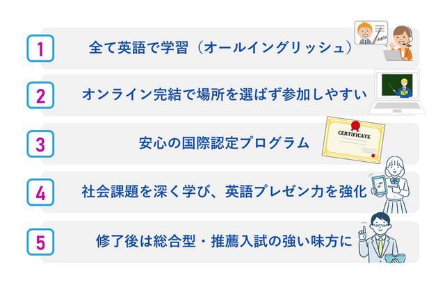 [画像2: https://prcdn.freetls.fastly.net/release_image/107104/143/107104-143-e872e14f78b95df3d2bf9e4ece62782a-1302x847.png?width=536&quality=85%2C75&format=jpeg&auto=webp&fit=bounds&bg-color=fff ]- 全て英語で学習(オールイングリッシュ)海外講師による指導のもと、英語でのディスカッションやプレゼンを実践。英検準2級以上のレベルがあれば参加可能で、語学力の一層の伸長が期待できます。