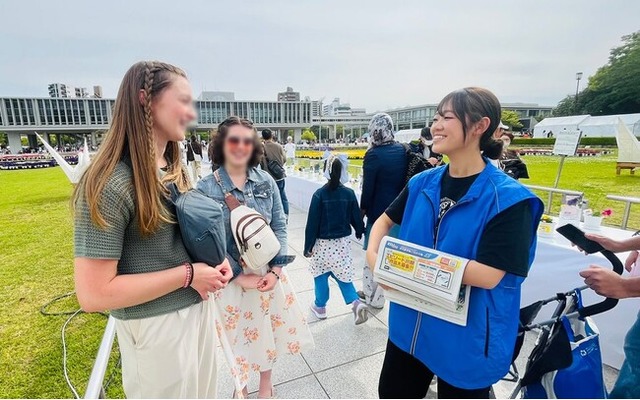 当日は、広島を訪れた外国人観光客の方々に対し、会場案内やイベント情報の説明、広島の観光地の紹介などを行いました。単なる翻訳に留まらず、文化的背景や言葉のニュアンスを補足しながら伝えることを心がけたそうです。特に、通りかかった外国人観光客の方にまず挨拶をし、声をかけることで、気軽に話しかけてもらえる雰囲気をつくるよう工夫したとのことでした。