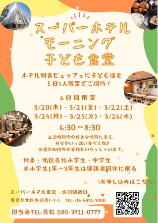 「Natural, Organic, Smart」をコンセプトに国内173店舗のホテル運営を手掛ける株式会社スーパーホテル(所在地:大阪府大阪市、代表取締役社長:山本健策)は、2025年3月20日(木)~2025年3月26日(水)(3月23日(日)を除く)の期間中、東京都北区のスーパーホテル東京・赤羽駅南口でホテル朝食ビュッフェに北区在住の小学生・中学生を無料で招待する「モーニング子ども食堂」を初めて開催しました。