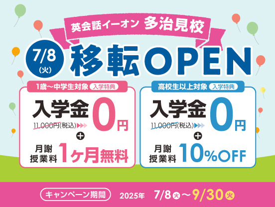 オープンにあたり「英会話体験無料特別イベント」及び「移転オープンキャンペーン」を実施いたします。