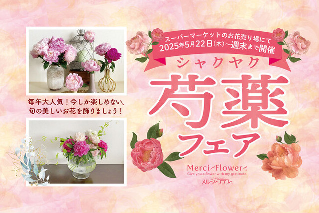 首都圏内約650店舗のスーパーマーケットのお花売り場を中心に量販店向けカジュアルフラワーの製造・卸し、生花の委託販売、店舗運営を行う株式会社メルシーフラワー(本社:神奈川県相模原市、代表取締役:大間岩夫)は、「芍薬フェア」を2025年5月22日(木)から週末までスーパーマーケットのお花売り場にて開催いたします。このフェアは、旬の芍薬を“普段の暮らしで気軽に飾る”をテーマに、高価なイメージのある芍薬をスーパーマーケットで手頃な価格で販売し、花の良さを身近に感じて欲しいことを目指しています。