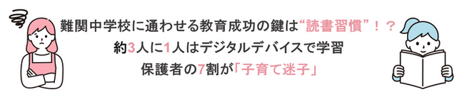偏差値60以上のいわゆる「難関中学校」*1に通う子どもを持つと申告した保護者の56.8%が「子どもに伸ばしてほしい力」の中から「思考力」の構築につながった、またはつながると思う教育方法として「読書習慣をつける」と回答*3。