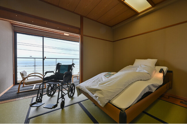 お食事処に近い3階フロアのお部屋を改修いたしました。お部屋は全室オーシャンビューで伊勢湾を一望できます。リクライニングベッド2台で角度調整も可能。和室は12.5畳の広さで、車椅子での移動や介助にも十分なスペースを確保しています。また、源氏物語の世界観や薫りをお愉しいただけます。