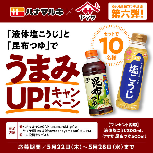 味噌・醸造製品メーカーのハナマルキ株式会社(本社:長野県伊那市、代表取締役社長:花岡周一郎、以下当社)は、ヤマサ醤油株式会社の「ヤマサ 昆布つゆ」と当社の「液体塩こうじ」のコラボレシピを、 2025年 5月 22日(木)より当社ホームページおよびレシピサイト「Nadia」にて公開します。また、ハナマルキ公式 SNSアカウントでは、両商品が当たるプレゼントキャンペーンを実施します。