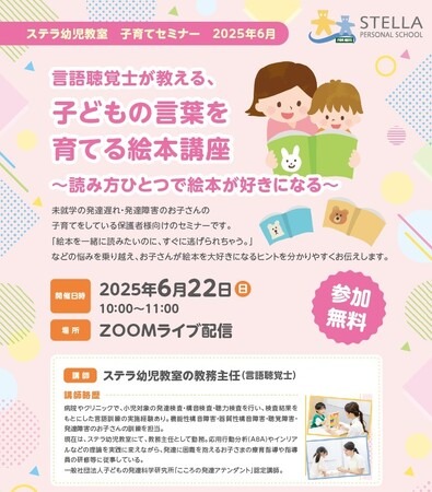 2025年6月22日(日)、株式会社GUTS(本社:名古屋市)が運営する個別療育専門の児童発達支援施設「ステラ幼児教室」は、当社教務主任(言語聴覚士)を講師として、子育てセミナー「言語聴覚士が教える、子どもの言葉を育てる絵本講座~読み方ひとつで絵本が好きになる~」を開催いたします。