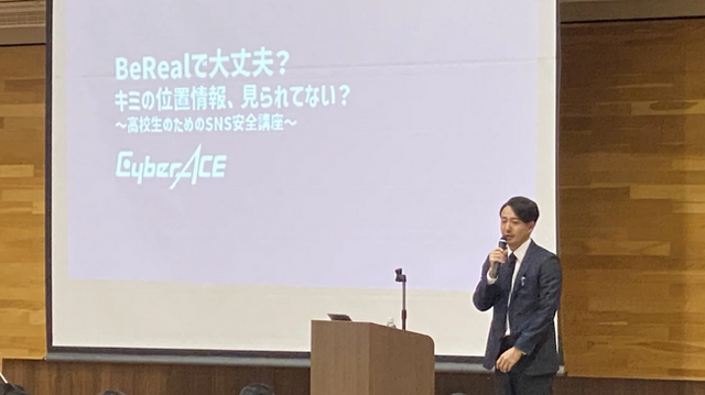 株式会社サイバーエース(本社:東京都渋谷区、代表取締役社長:西島大、以下「当社」)は4月10日、鳥取県の鳥取城北高等学校において、同校の生徒600人を対象にSNS(ソーシャルネットワーキングサービス)の安全利用に関する啓発セミナー「BeRealで大丈夫?キミの位置情報、見られてない?~高校生のためのSNS安全講座~」を実施しました。デジタル領域に強みを持つ広告代理店である当社の専門知識を活かし、新興SNSアプリ「BeReal(ビーリアル)」を起点に、若年層が直面しがちなSNS利用上のリスクについて分かりやすく解説しました。