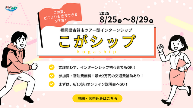 福岡県古賀市では、古賀市の将来を担う人材の育成と地元定着を促進するため初めての試みとして、大学や専門学校、短大、高専の学生を対象としたツアー型インターンシップ「こがシップ」を夏休み期間の5日間開催します(受託運営:株式会社Asian Bridge)。