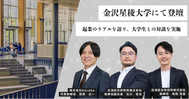 株式会社SoLabo(本社:東京都渋谷区、代表取締役 田原 広一)の代表取締役 田原 広一は、白潟総合研究所株式会社 (本社:東京都中央区、代表取締役社長:⽩潟 敏朗)の取締役副社長 石川 哲也、取締役 畦田 佑登と共に、金沢星稜大学にて大学生に向けて特別講演、大学生との対談を行います。