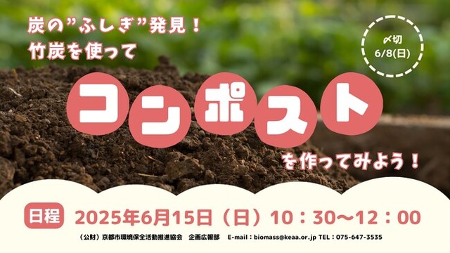 公益財団法人京都市環境保全活動推進協会(所在地:京都市伏見区深草池ノ内13、理事長:新川達郎)は、持続可能な社会の実現を目指し、未利用バイオマス有効活用推進事業を展開しています。その一環として、2025年6月15日(日)に、炭の有用性や活用方法について学ぶとともに、脱炭素に対する興味・関心を深めることを目的としたイベント「炭の”ふしぎ”発見!竹炭を使って『コンポスト』を作ってみよう!」を開催します。