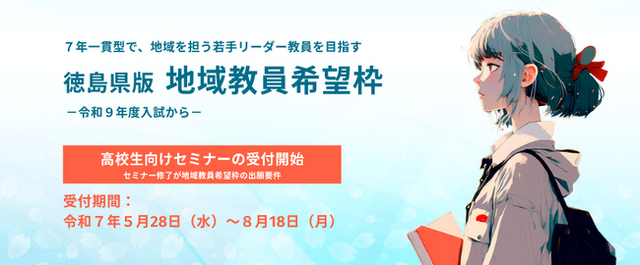 今後、徳島県の小学校教師を目指す強い意欲を持った学生を、令和9年度入試(令和8年度実施)から「地域教員希望枠」として募集します。徳島県内の高校生に限らず県外からも出願可能とし、入学定員は5名です。