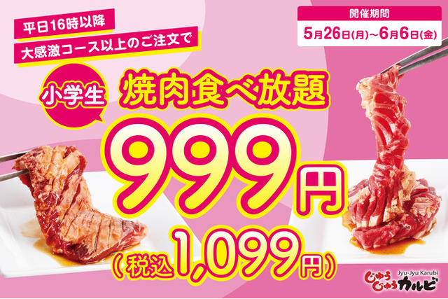 株式会社トマトアンドアソシエイツ(本社:兵庫県西宮市、代表取締役社長:笹村 啓介)が運営する、焼肉食べ放題「じゅうじゅうカルビ」では、2025年5月26日(月)~ 6月6日(金)の期間限定で、小学生の食べ放題料金を999円(税込1,099円)にてご提供いたします。